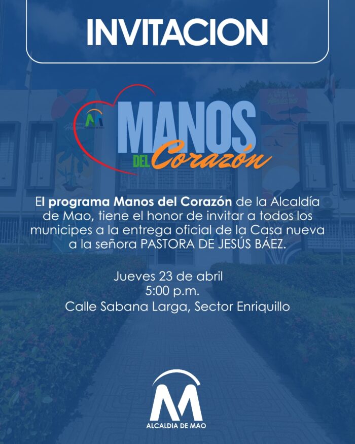 La Alcaldía de Mao invita a los munícipes a acompañarnos en la entrega oficial de una vivienda a la señora Pastora De Jesús Báez, a través del programa Manos del Corazón.