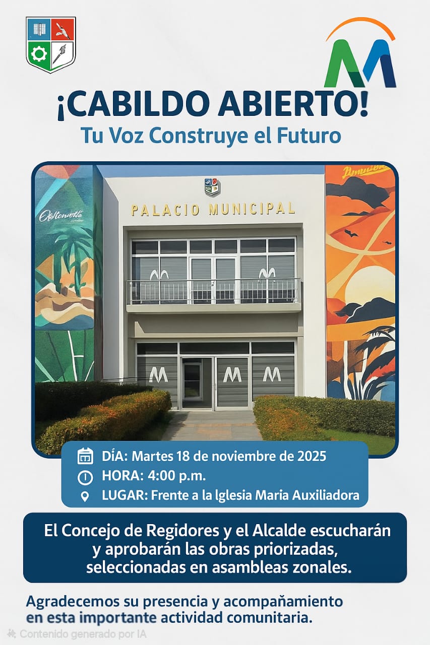 El Cabildo Abierto es HOY, y su participación es esencial. Les invitamos a unirse esta tarde para escuchar, proponer y decidir juntos las obras priorizadas por los munícipes en las asambleas zonales.