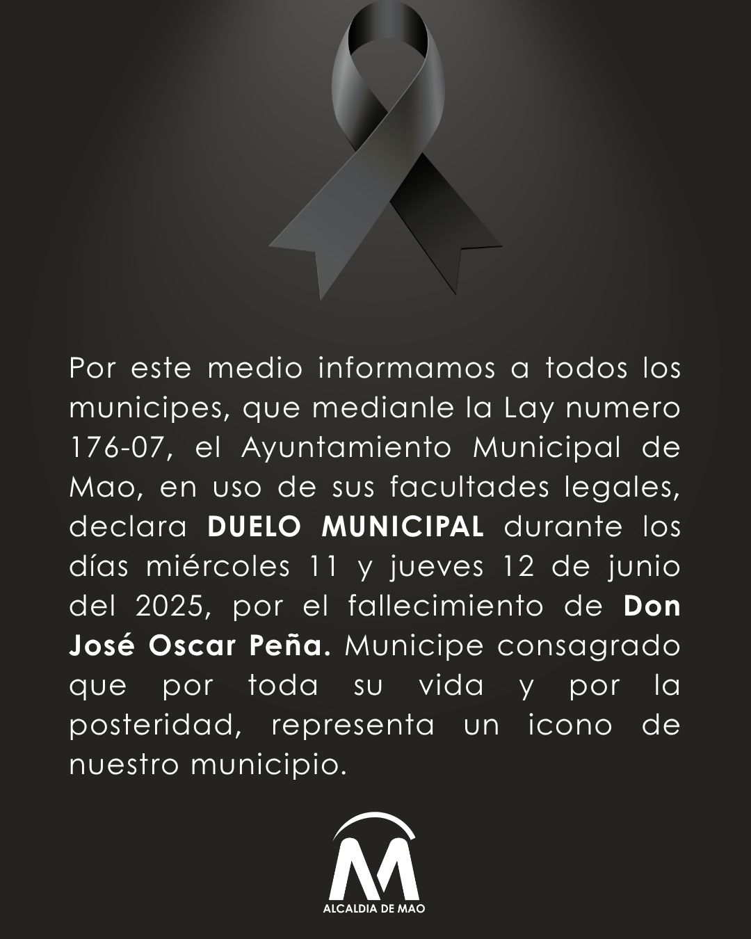 El Ayuntamiento del municipio de Mao declaró este martes duelo municipal y dispuso izar la bandera a media asta por el fallecimiento del destacado munícipe Don Óscar Peña, en reconocimiento a su trayectoria ejemplar y sus aportes al desarrollo social y comunitario de esta ciudad.