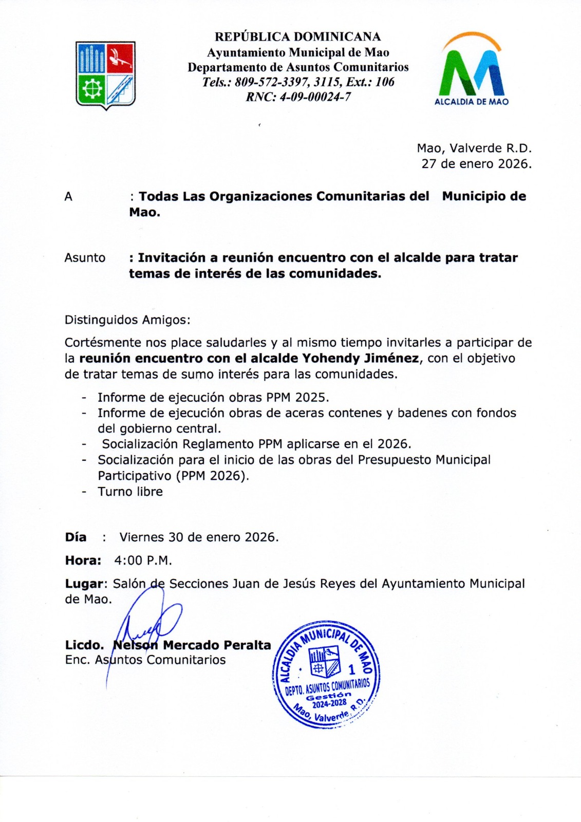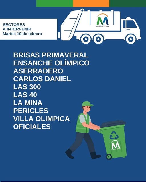 Alcalde Yohendy Jiménez participa en encuentro regional de FEDOMU sobre gestión de residuos sólidos en Mao SECTORES A INTERVENIR HOY 10/2/2026 Alcaldía de Mao respalda jornada de inscripción de cursos gratuitos dirigida a la población Alcalde Yohendy Jiménez Bonilla sostiene reunión con Junta de Vecinos del sector Los Restauradores Convocatoria a organizaciones comunitarias de Mao Invitación Premio Al Merito Juvenil 2026 La Alcaldía de Mao interviene el vertedero municipal y refuerza la vigilancia para evitar nueva obstrucción del camino Resumen de Ejecutorias de la Alcaldía de Mao Semana del 29 de septiembre al 5 de octubre de 2025 Alcaldía de Mao traza metas para el 2025 en reunión con encargados departamentales