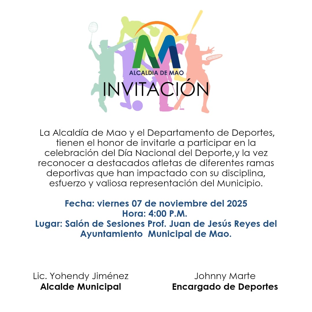La Alcaldía de Mao y el Departamento de Deportes te invitan este viernes 7 de noviembre a las 4:00 p.m. en el Ayuntamiento de Mao, donde se reconocerán atletas destacados y personalidades por su aporte al deporte.