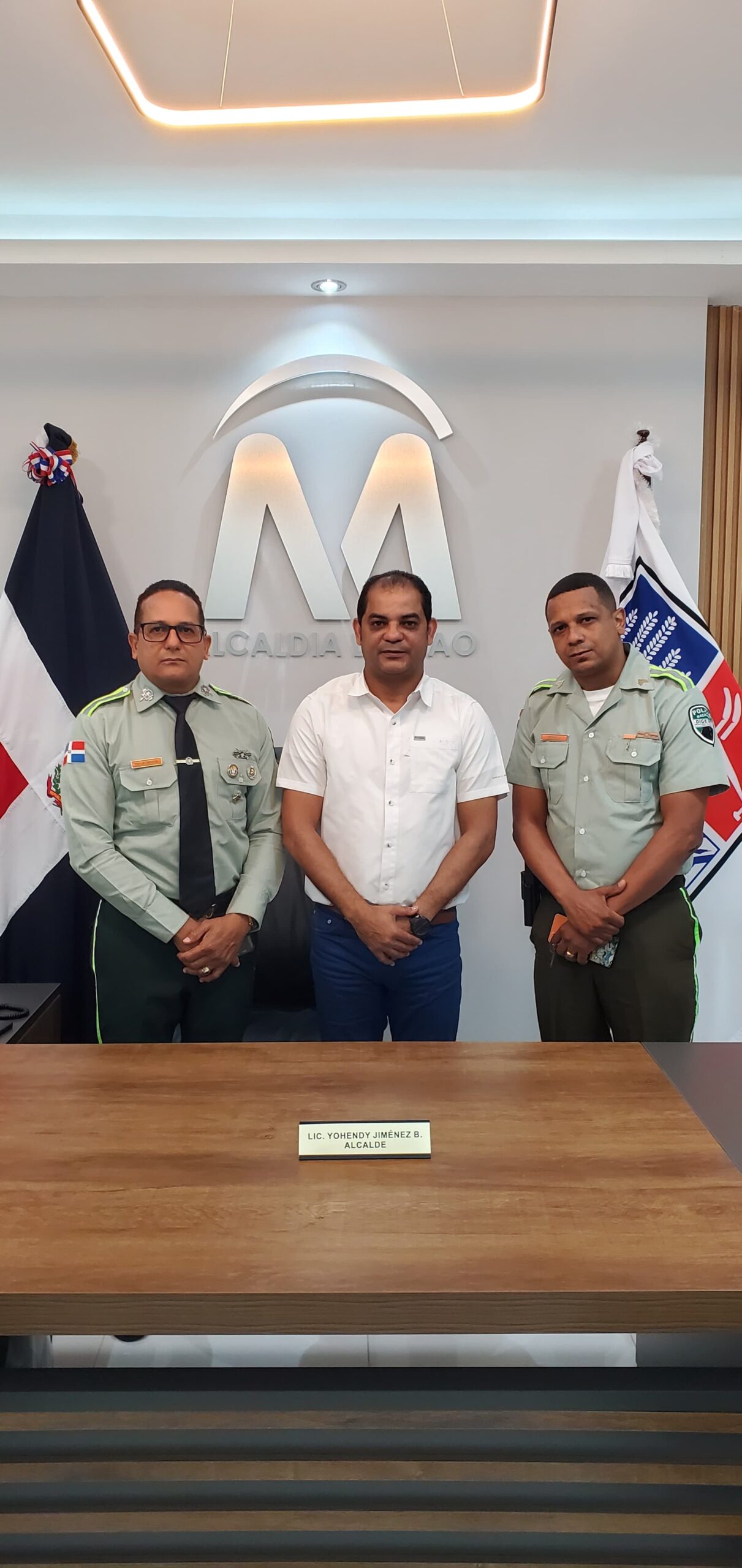 El coronel Lic. Fidel De la Cruz Alcántara, P.N., director regional Noroeste de DIGESETT en Mao, acompañado de su ayudante, el sargento Lic. Reyes Liriano, P.N., fue recibido en el despacho del alcalde Yohendy Jiménez Bonilla. Durante el encuentro, conversaron sobre temas relacionados con el tránsito en el municipio de Mao.