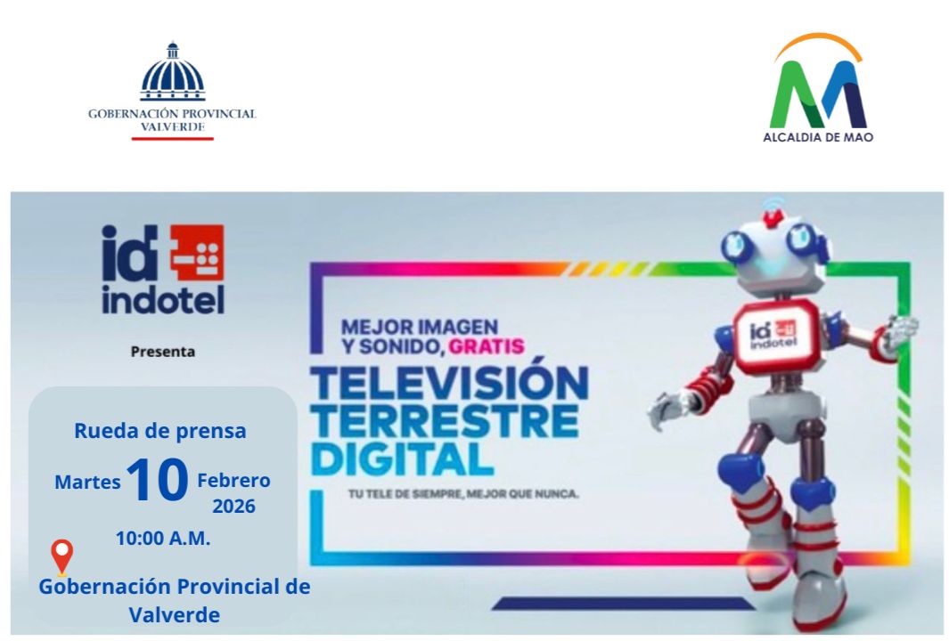 La Gobernación Provincial de Valverde, en coordinación con INDOTEL y la Alcaldía de Mao, invita a los medios de comunicación a la rueda de prensa donde se ofrecerán detalles sobre la Televisión Terrestre Digital, una iniciativa que permitirá a la población acceder a mejor imagen y sonido de manera gratuita.
